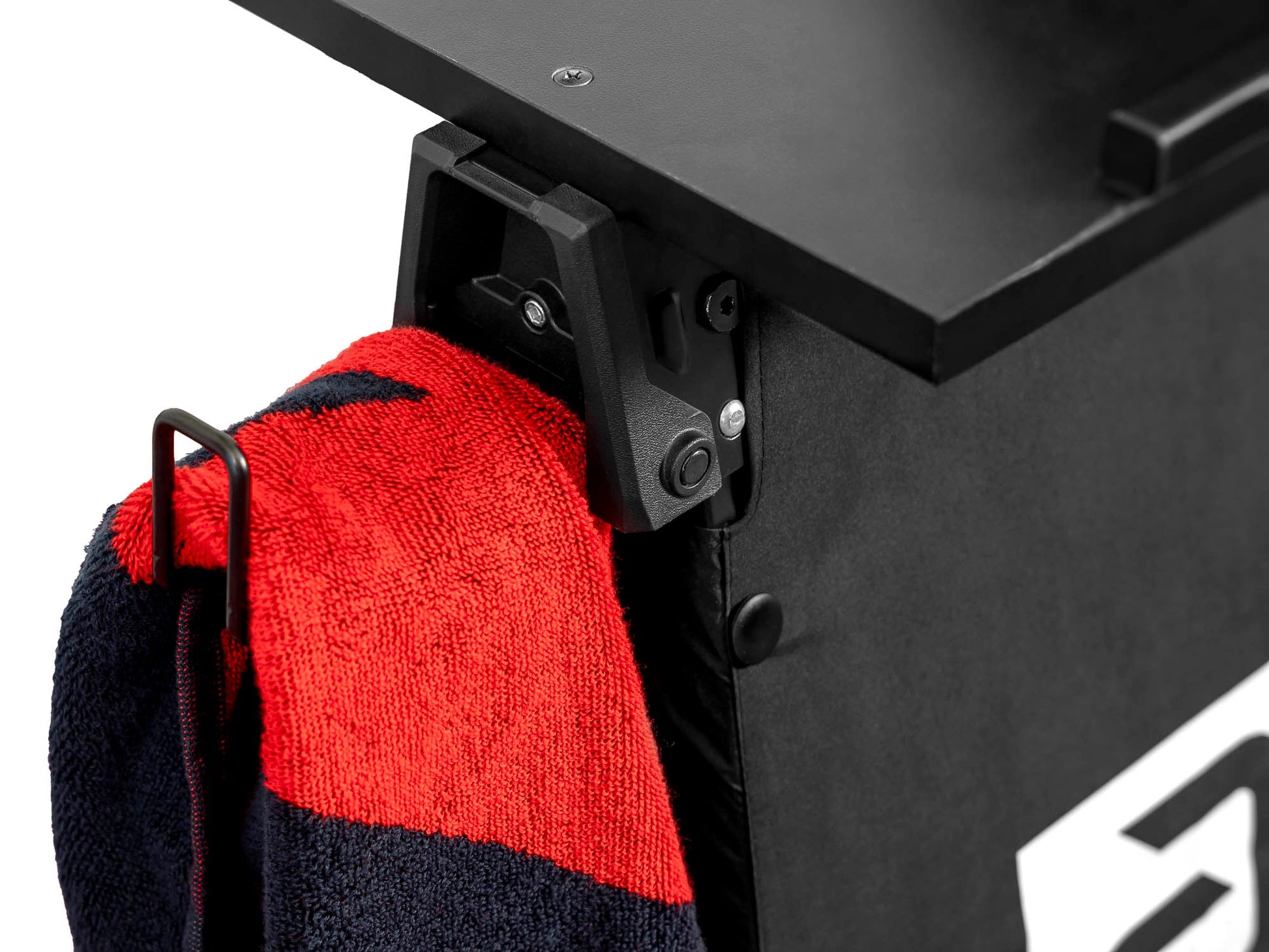 Praktische en robuuste scheidsrechterstafel met royale plank voor telborden (30 cm diep). Bovendien, met een individueel gewicht van slechts ca. 6 kg, erg handig. Met één druk op de knop kunnen de poten worden ontgrendeld en ingeklapt. Ruimtebesparende opslag in de kast of apparatuurruimte is dus mogelijk. Aan de zijkanten bevinden zich uitklapbare handdoekhaken.